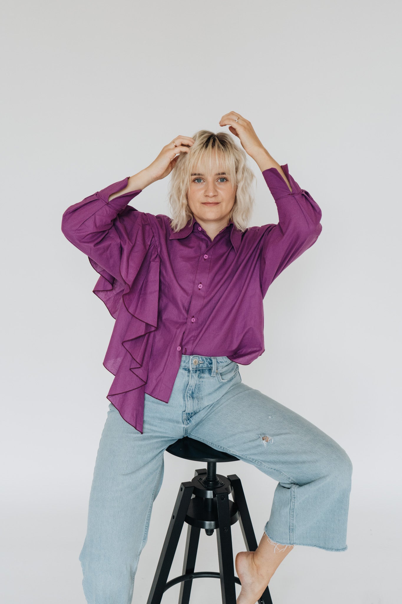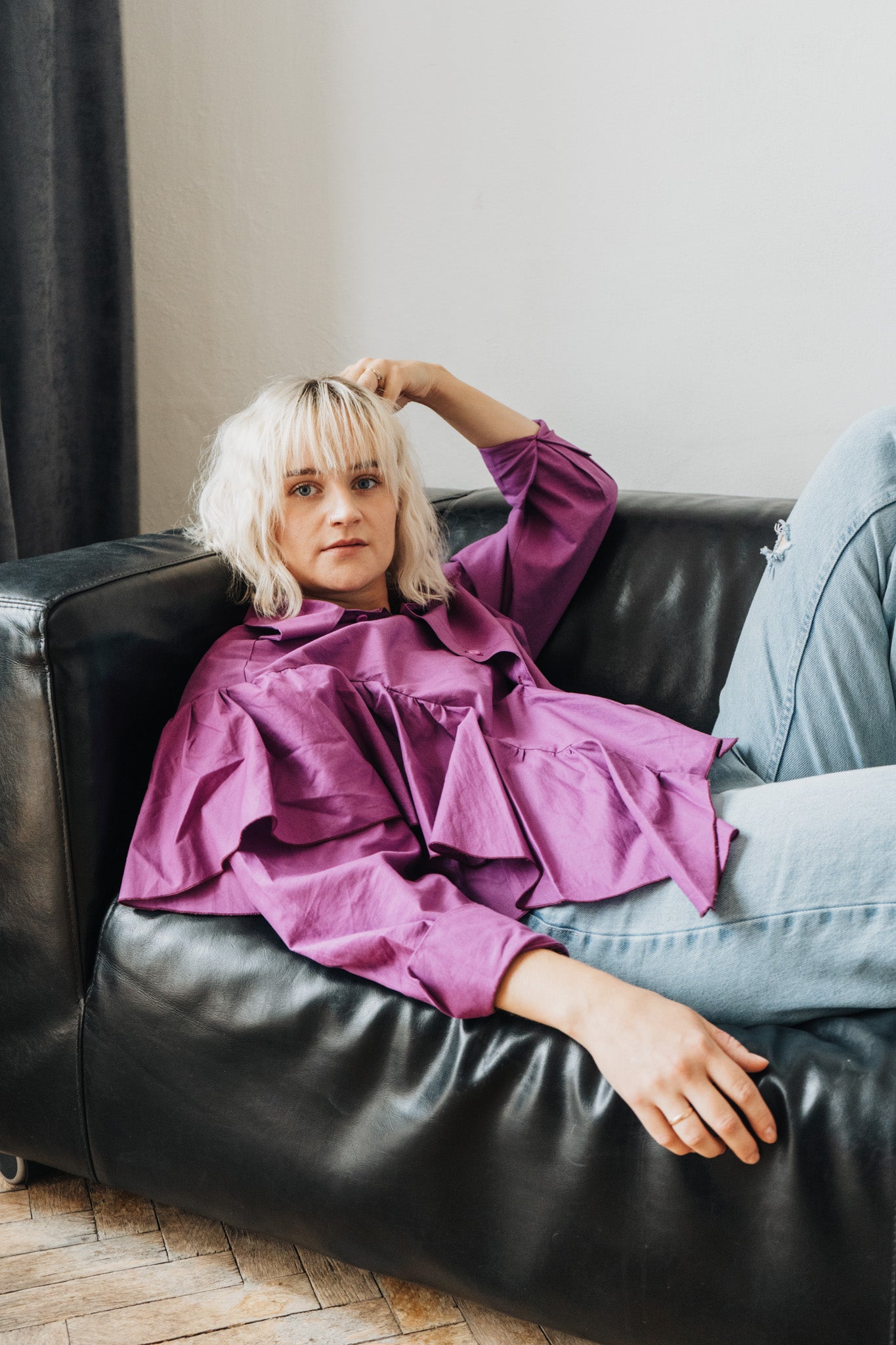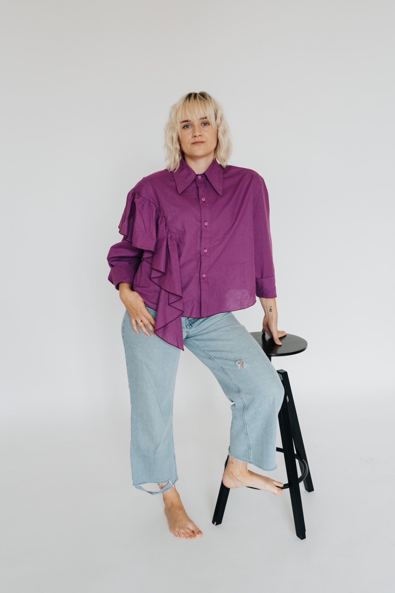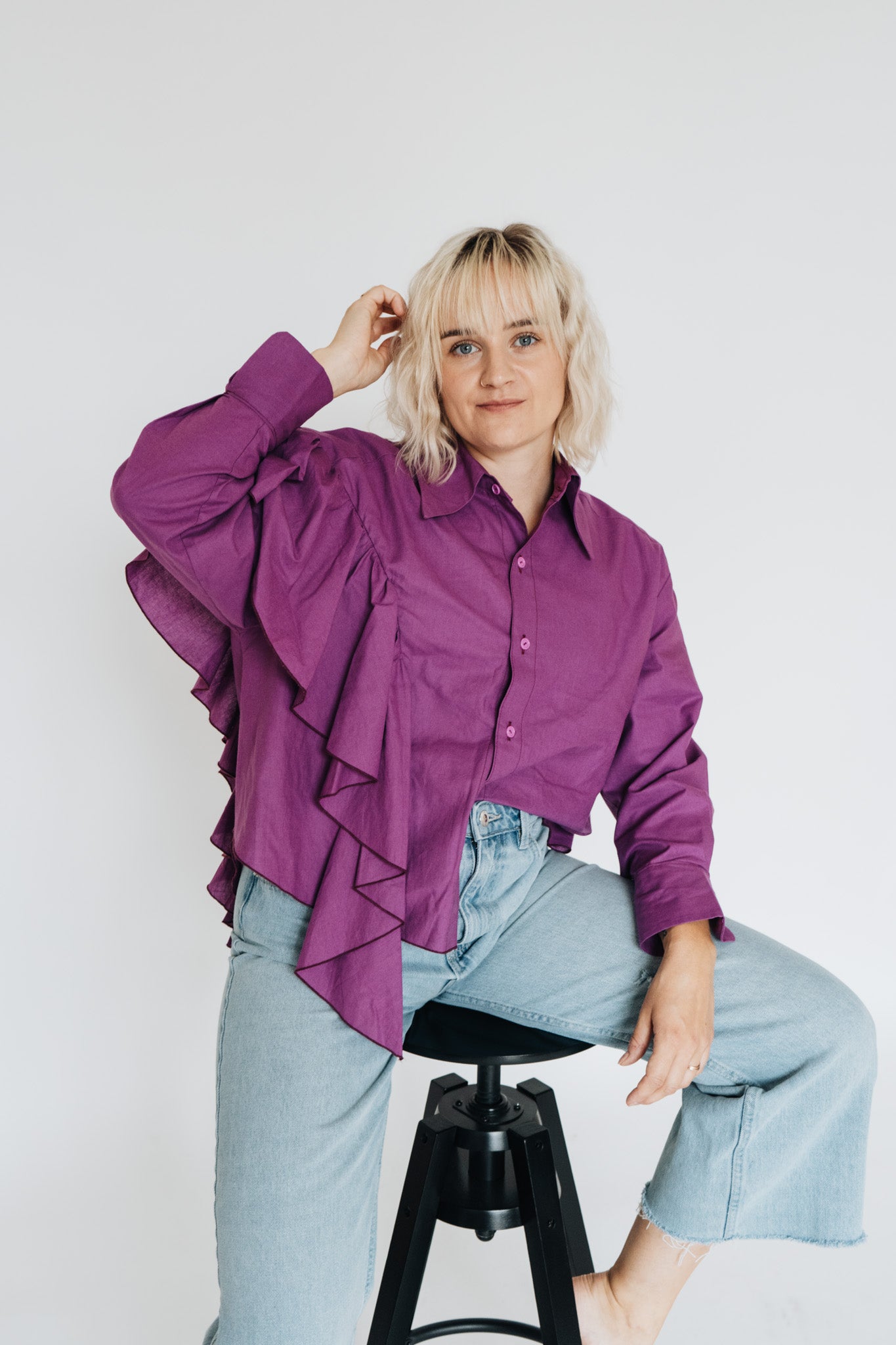 Košile, která není jen obyčejná. Oversize střih, výrazný volánek a límeček s knoflíčky jí dodávají ten správný šmrnc.