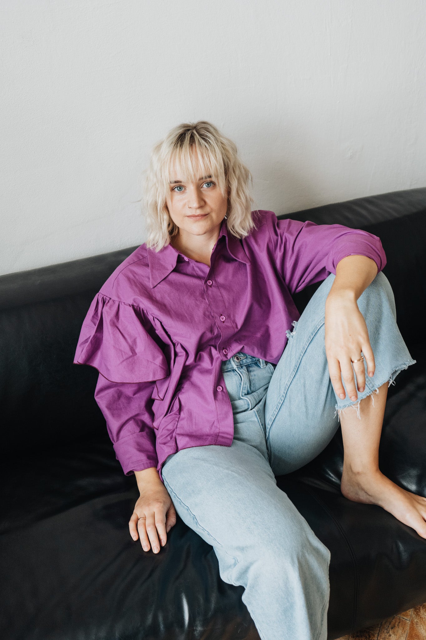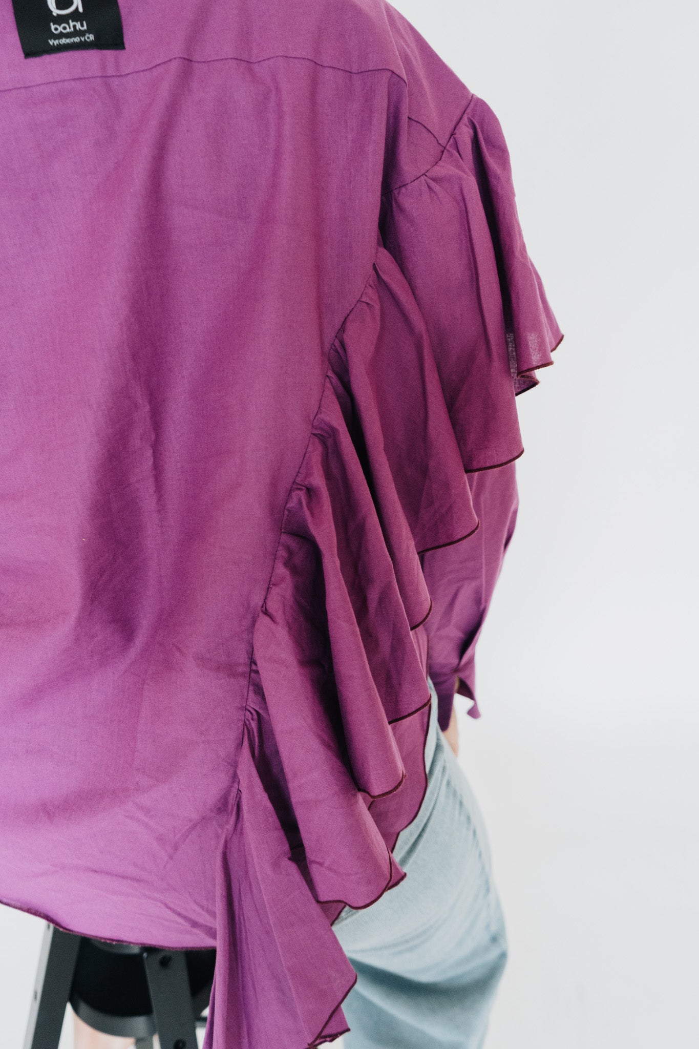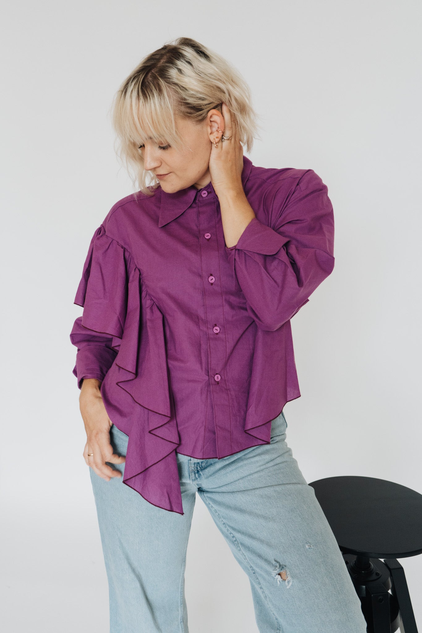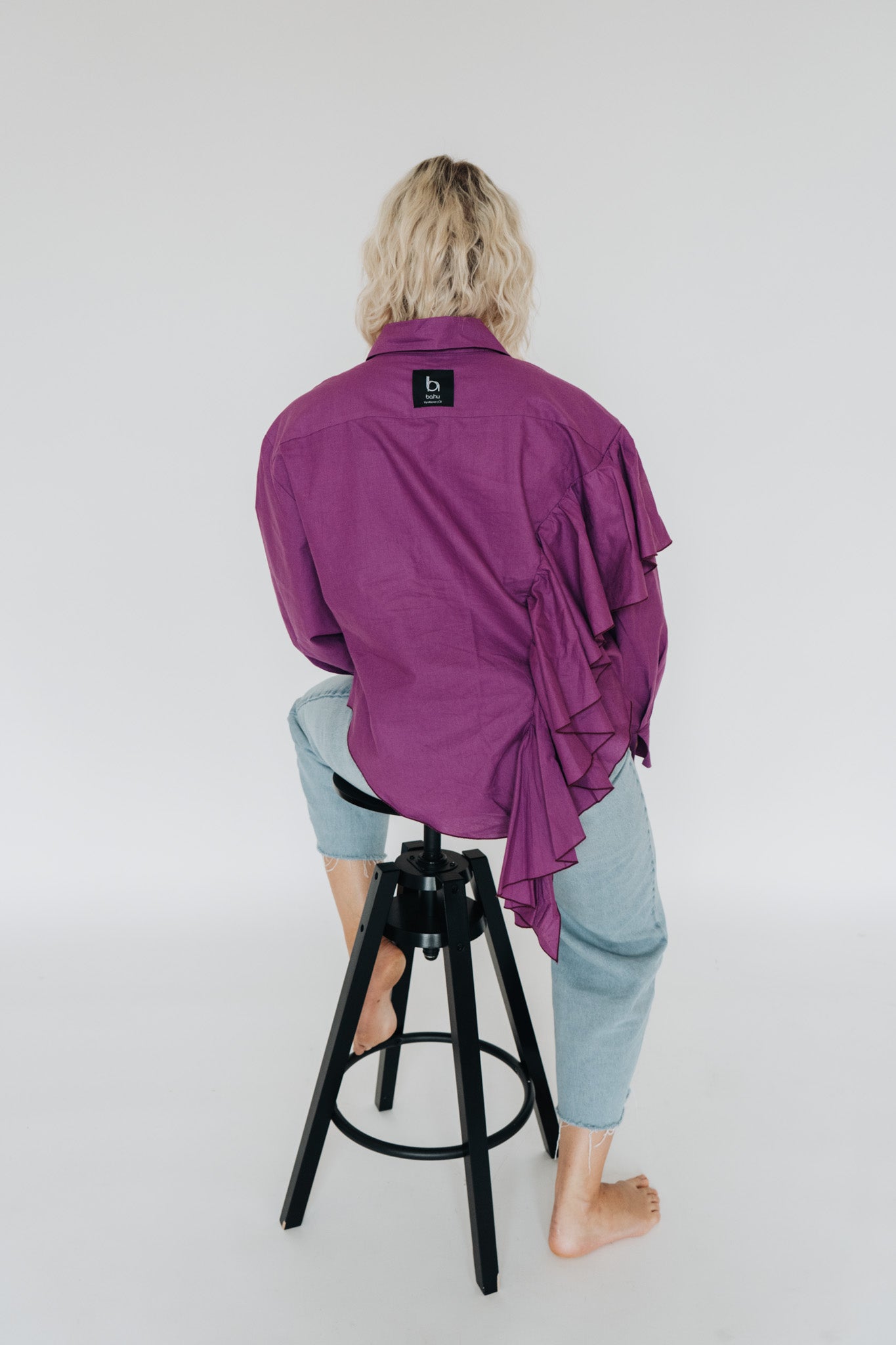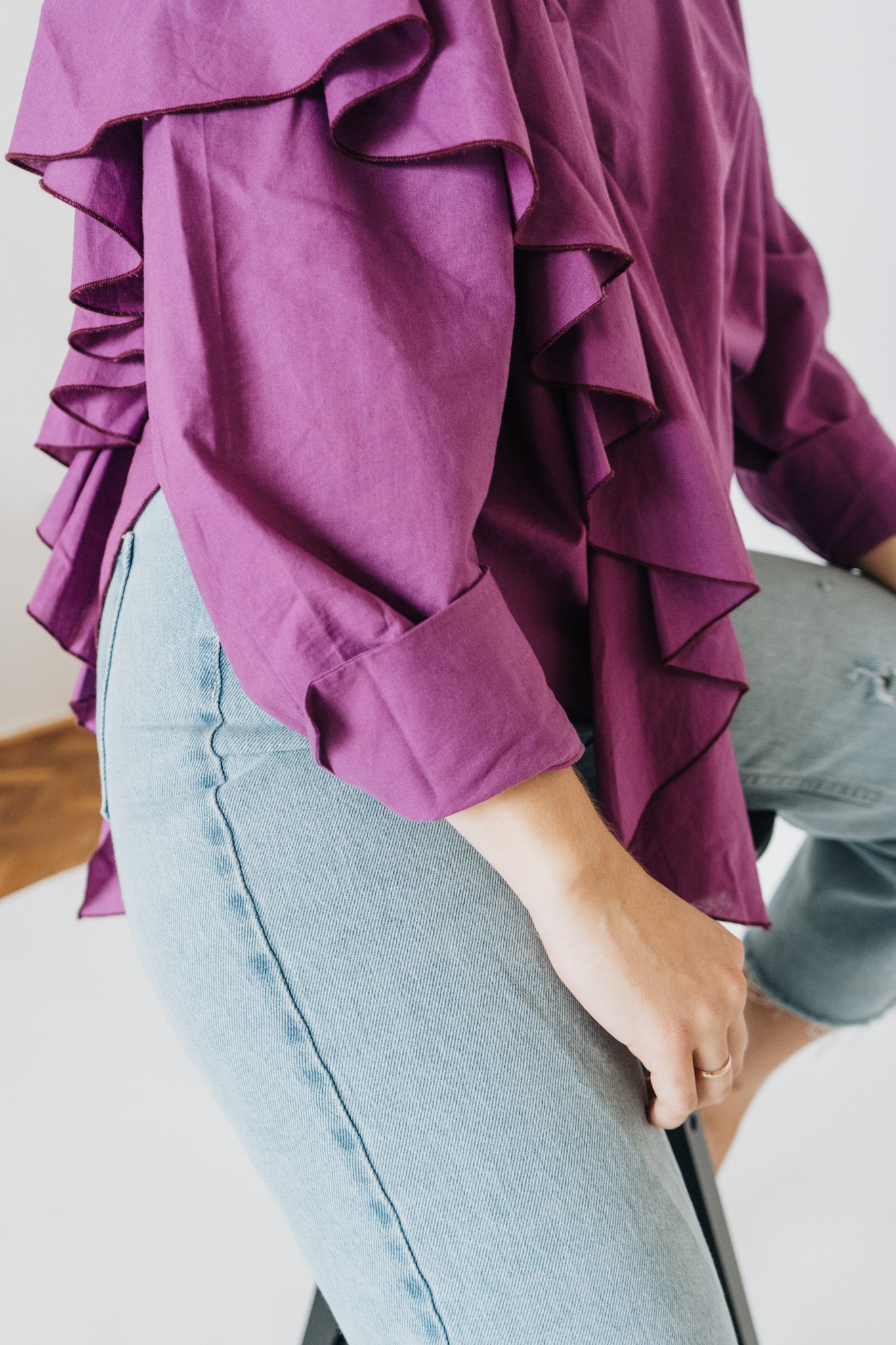 Košile, která není jen obyčejná. Oversize střih, výrazný volánek a límeček s knoflíčky jí dodávají ten správný šmrnc.