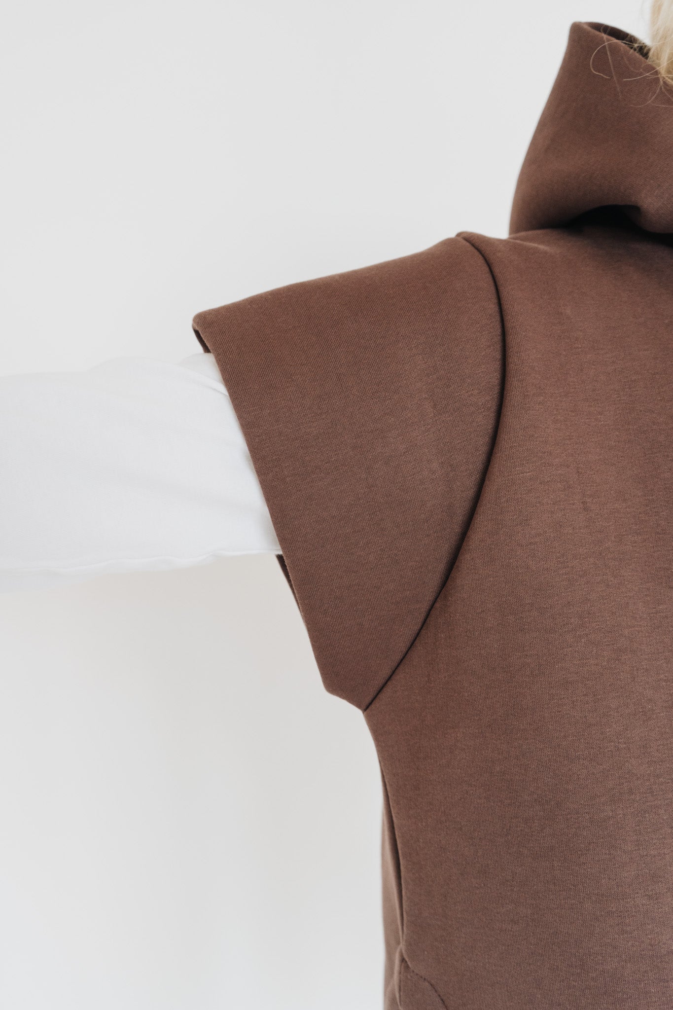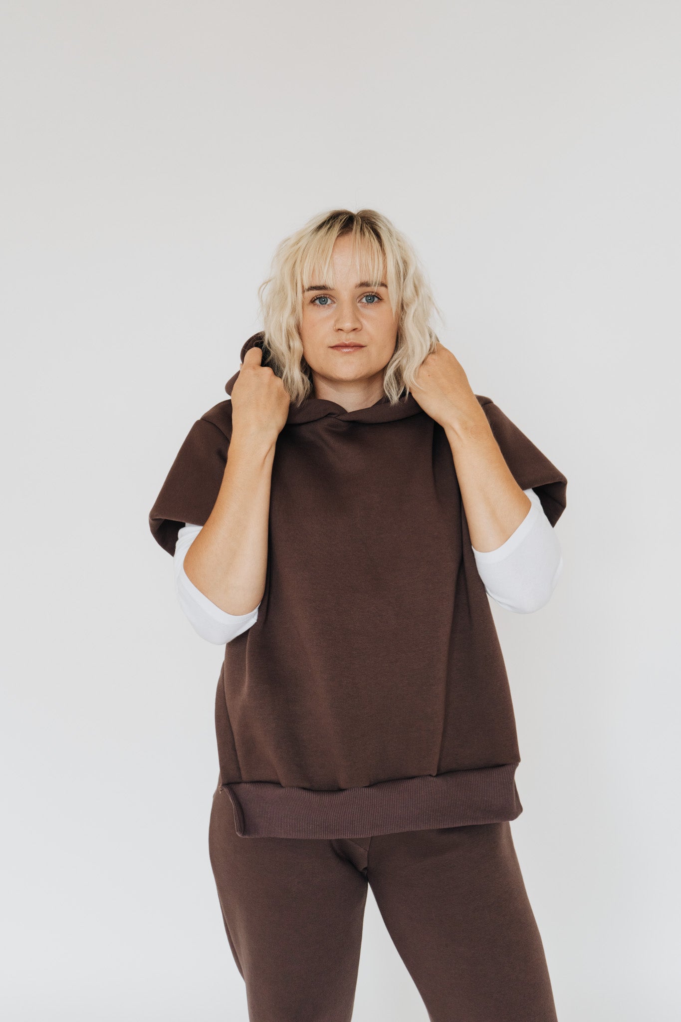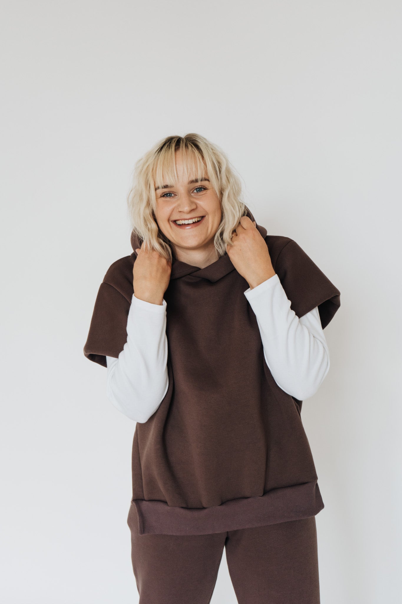Pohodlí zůstává, ale forma je jiná. Hnědý set s vestou a kapucí je pro mě nový způsob, jak nosit teplákovku – praktické, originální a ready kamkoli.