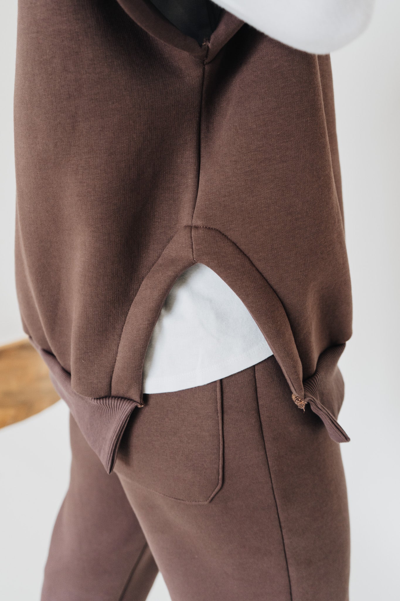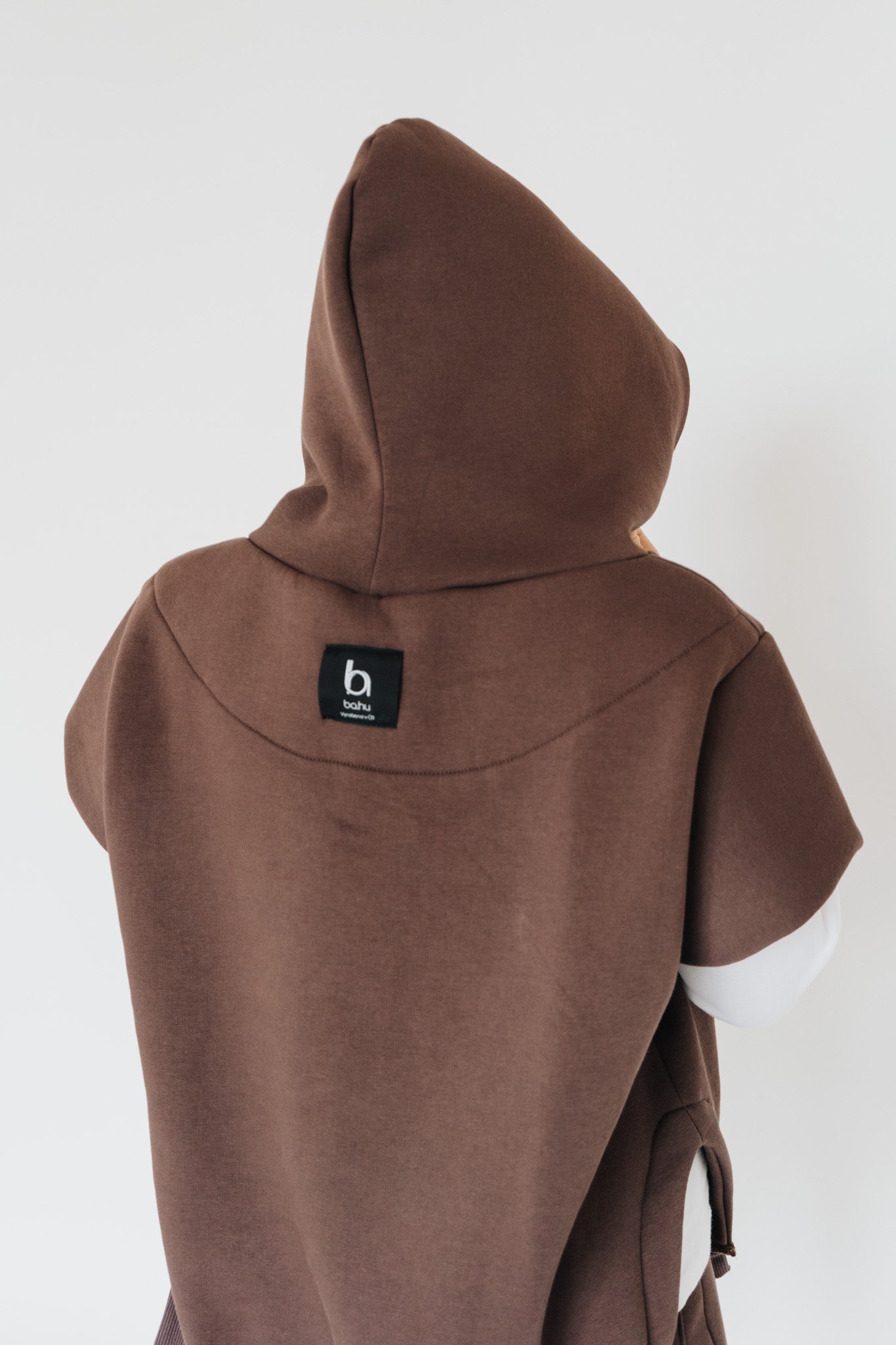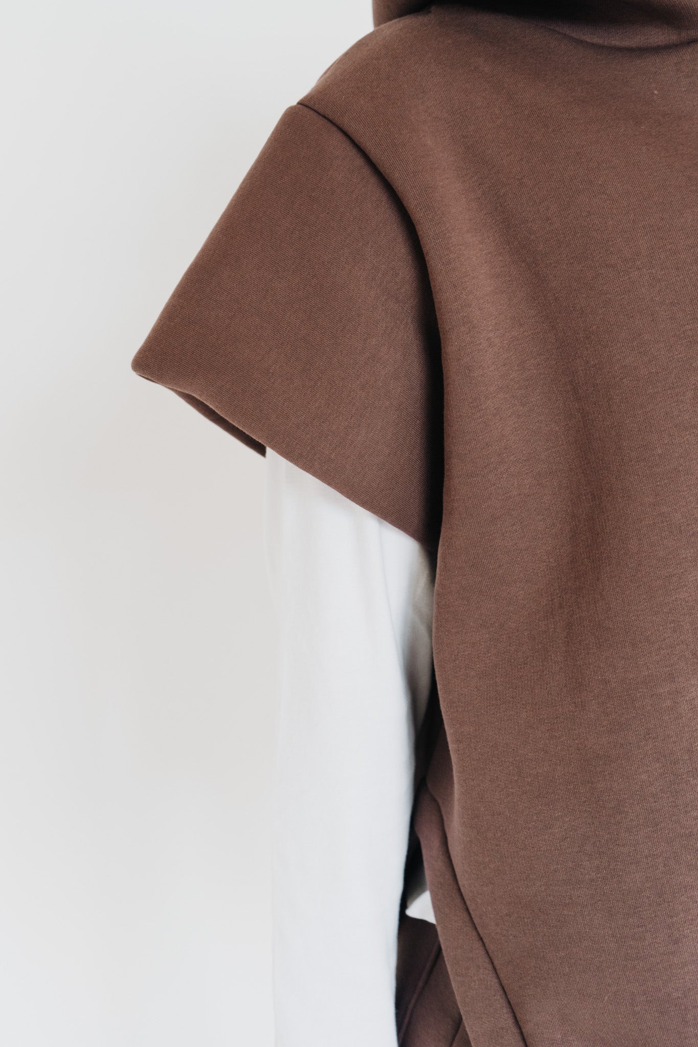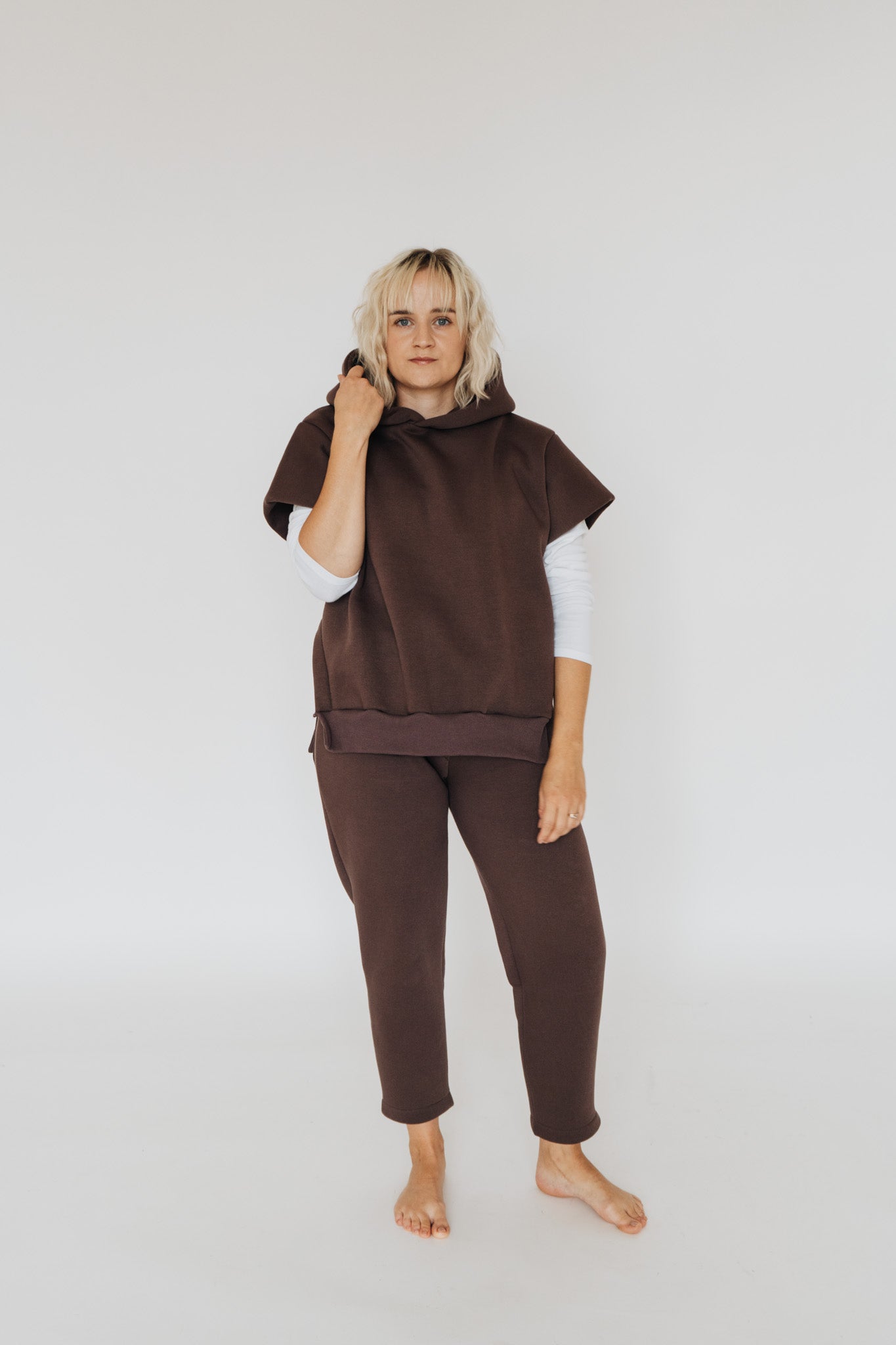 Pohodlí zůstává, ale forma je jiná. Hnědý set s vestou a kapucí je pro mě nový způsob, jak nosit teplákovku – praktické, originální a ready kamkoli.